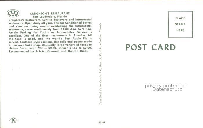 71953283 Fort Lauderdale Creighton`s Restaurant postalisch nicht gelaufen Erhaltung siehe scans KatCode: 14140110000000