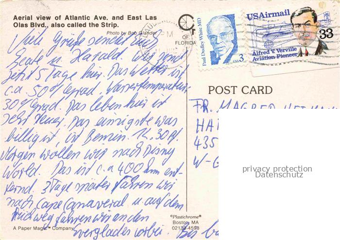 74090182 old postcard Fort Lauderdale Florida USA Fliegeraufnahme Atlantic Ave and East Las Olas Blvd postalisch gelaufen Erhaltung siehe scans [WerneD78] KatCode: 14140110000000