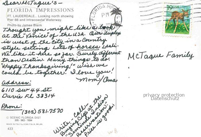 74156294 old postcard Fort Lauderdale Florida USA Intracoastal-Waterway Pier-66 Hochhaeuser Wohnviertel Kanal Palmen Boote Luftaufnahme postalisch gelaufen Fliegeraufnahme Erhaltung siehe scans [Karloger] KatCode: 14140110000000