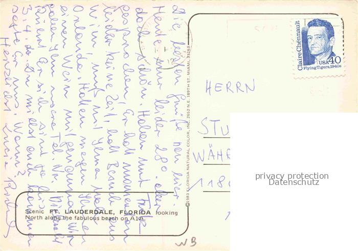 74156312 old postcard Fort Lauderdale Florida USA Strand Meer Hochhaeuser A1A Palmen Atlantik Hotels Promenade Luftaufnahme postalisch gelaufen Fliegeraufnahme Erhaltung siehe scans [Karloger] KatCode: 14140110000000