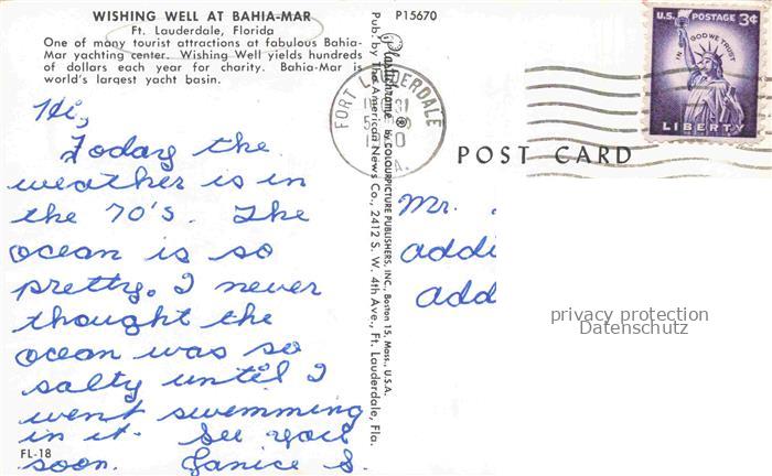 74063276 old postcard Fort Lauderdale Florida USA Wishing Well at Bahia Mar postalisch gelaufen Erhaltung siehe scans [WerneD78] KatCode: 14140110000000