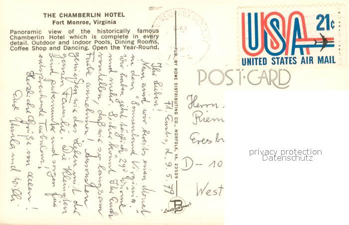 73645850 old postcard Fort Monroe The Chamberlin Hotel Durham North Carolina postalisch gelaufen Erhaltung siehe scans [WerneD78] KatCode: 14140490000000