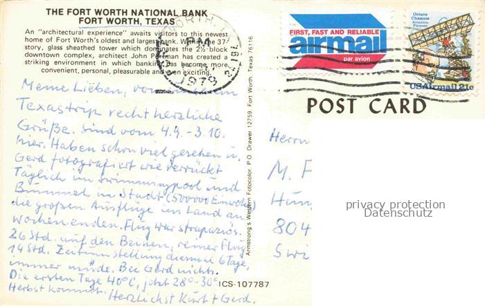 74118115 old postcard Fort Worth Texas USA The Fort Worth National Bank postalisch gelaufen Erhaltung siehe scans [WerneD78] KatCode: 14140460000000