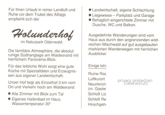 73171895 Fraenkisch-Crumbach Pension Holunderhof Kegelbahn Restaurant Hallenbad postalisch nicht gelaufen Werbekarte (keine Postkarte) Erhaltung siehe scans [FriedD77] KatCode: 11110006437007