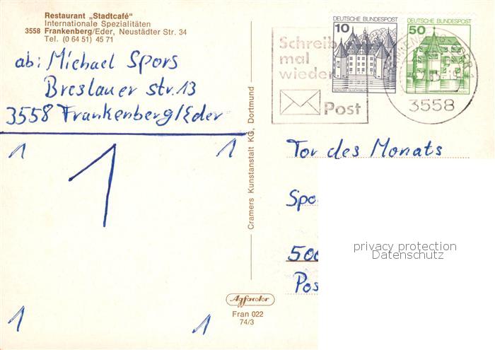 73866897 alte Postkarte Frankenberg Eder Fliegeraufnahme Restaurant Stadtcafe Gastraeume postalisch gelaufen Erhaltung siehe scans [WerneD78] KatCode: 11110006635011