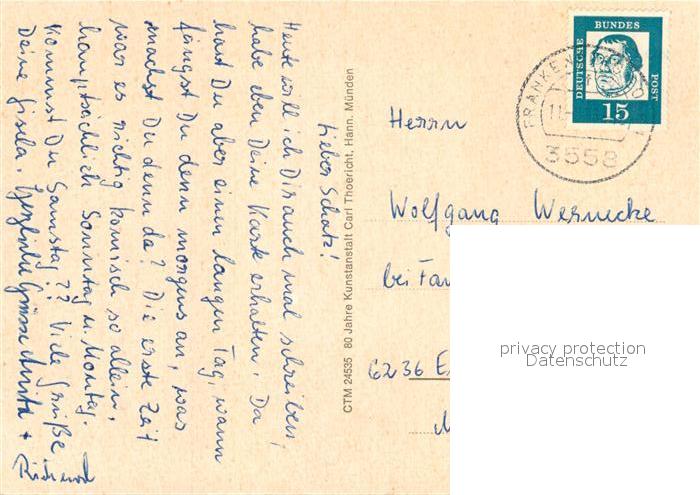 73155301 alte Postkarte Frankenberg Eder Rathaus Obermarkt Eder Stadtpanorama Kreiskrankenhaus Neustaedter Strasse Fachwerkhaeuser postalisch gelaufen Erhaltung siehe scans [FriedD77] KatCode: 11110006635011