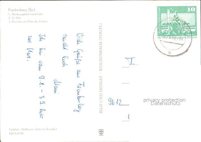 72373057 alte Postkarte Frankenberg Sachsen Neubaugebiet Luetzelhoehe Park Brunnen Platz der Einheit postalisch gelaufen Erhaltung siehe scans KatCode: 11110014182120