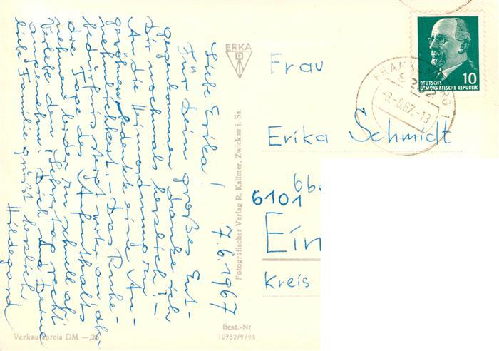 73884113 alte Postkarte Frankenberg Sachsen Platz der Einheit Blick vom Kirchturm Schilfeich Karl Marx Strasse Luetzelshoehe Verwaltungsschule postalisch gelaufen Erhaltung siehe scans [FriedD77] KatCode: 11110014182120