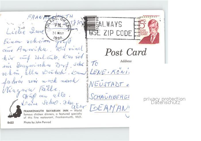 72300620 old postcard Frankenmuth Bavarian Inn Hotel postalisch gelaufen Erhaltung siehe scans KatCode: 14140240000000