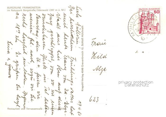 73203436 alte Postkarte Frankenstein Bergstrasse Burgruine Fernsicht postalisch gelaufen Erhaltung siehe scans [FriedD77] KatCode: 11110006411000