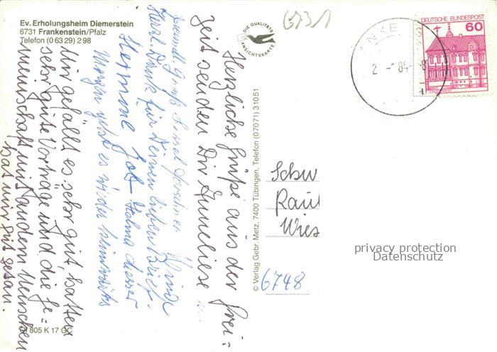 74046745 alte Postkarte Frankenstein Pfalz Ev Erholungsheim Diemerstein postalisch gelaufen Erhaltung siehe scans [WerneD78] KatCode: 11110007335010