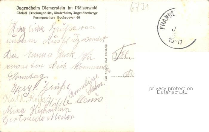 31714521 alte Postkarte Frankenstein Pfalz Jugendheim Diemerstein postalisch gelaufen Erhaltung siehe scans KatCode: 11110007335010