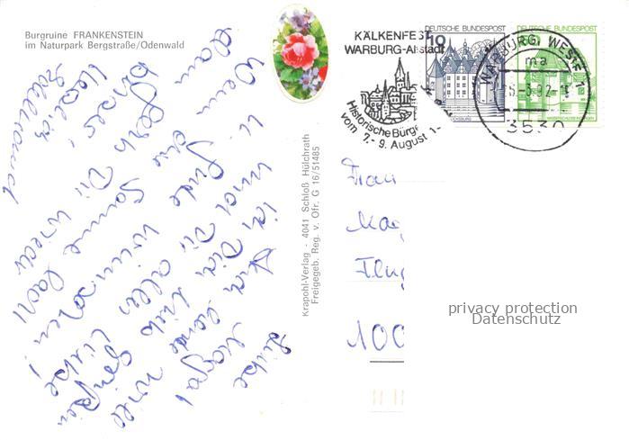 74037075 alte Postkarte Frankenstein Pfalz Panorama Burgruine Frankenstein Naturpark Bergstrasse Odenwald postalisch gelaufen Fliegeraufnahme Erhaltung siehe scans [FriedD77] KatCode: 11110007335010