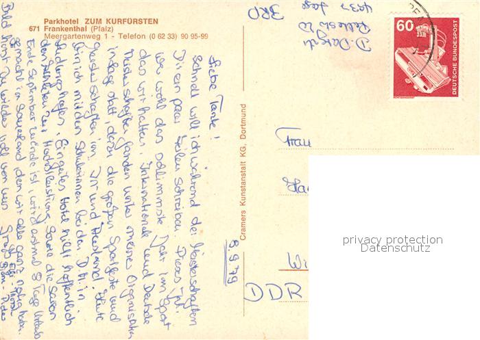 73542893 alte Postkarte Frankenthal Pfalz Parkhotel zum Kurfuersten Restaurant See Fliegeraufnahme postalisch gelaufen Erhaltung siehe scans [FriedD77] KatCode: 11110007311000