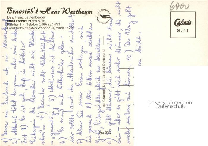 73570099 Frankfurt Main Braustueb’l Haus Wertheym Gastraum postalisch nicht gelaufen Erhaltung siehe scans [FriedD77] KatCode: 11110006412000