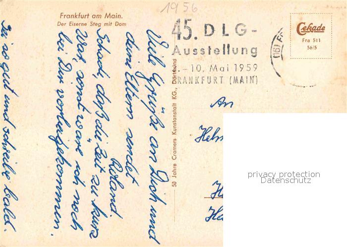 72909256 alte Postkarte Frankfurt Main Eiserne Steg Dom postalisch gelaufen Erhaltung siehe scans [NatalD47] KatCode: 11110006412000