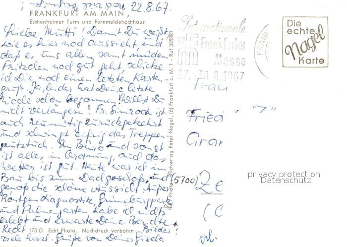 73123057 alte Postkarte Frankfurt Main Eschenheimer Turm Fernmeldehochhaus postalisch gelaufen Erhaltung siehe scans [KathaD81] KatCode: 11110006412000