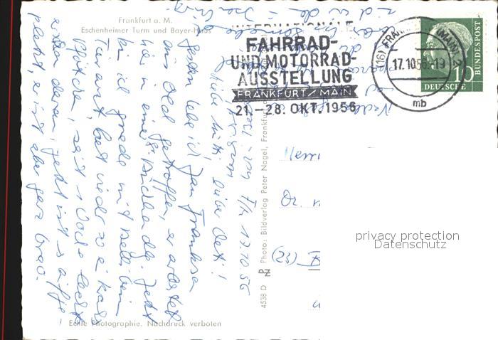 72596495 alte Postkarte Frankfurt Main Eschenheimer Turm und Bayer Haus postalisch gelaufen Erhaltung siehe scans [FriedD77] KatCode: 11110006412000