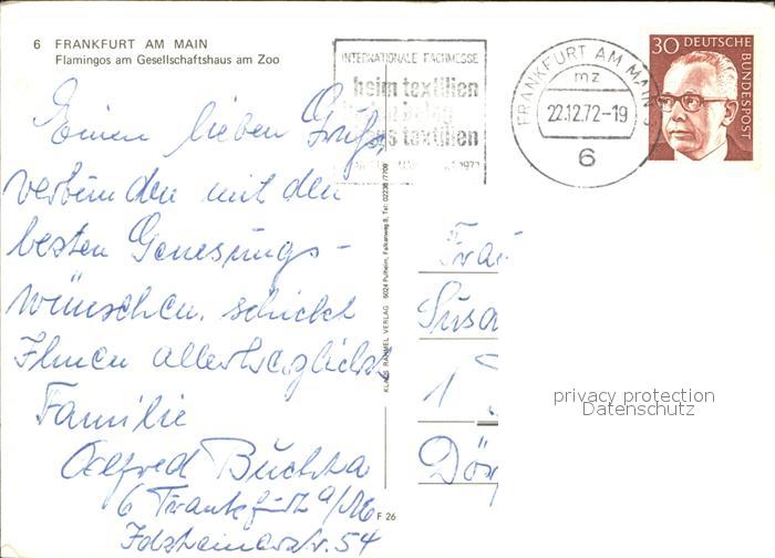 72466448 alte Postkarte Frankfurt Main Flamingos am Gesellschaftshaus am Zoo postalisch gelaufen Erhaltung siehe scans KatCode: 11110006412000