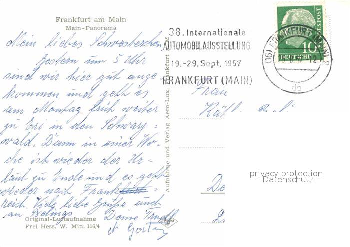 72691527 alte Postkarte Frankfurt Main Fliegeraufnahme Mainpartie postalisch gelaufen Erhaltung siehe scans [LiesaD40] KatCode: 11110006412000