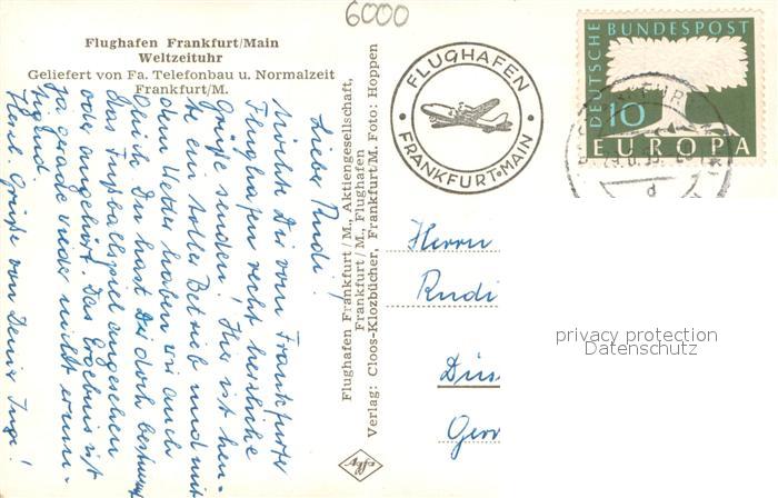 73706184 alte Postkarte Frankfurt Main Flughafen Weltzeituhr postalisch gelaufen Erhaltung siehe scans [LiesaD40] KatCode: 11110006412000