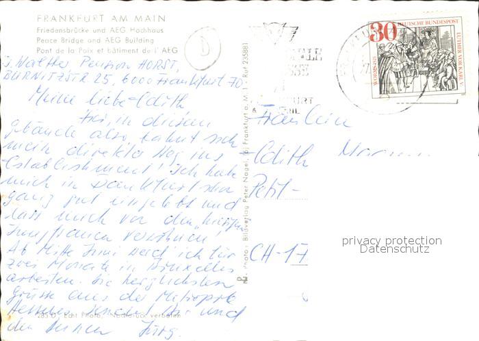 72168239 alte Postkarte Frankfurt Main Friedensbruecke Main AEG Hochhaus postalisch gelaufen Erhaltung siehe scans KatCode: 11110006412000