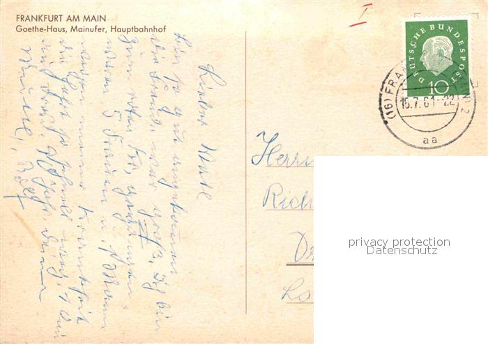 72647311 alte Postkarte Frankfurt Main Hauptbahnhof Goethe-Haus Mainufer postalisch gelaufen Erhaltung siehe scans [NatalD47] KatCode: 11110006412000