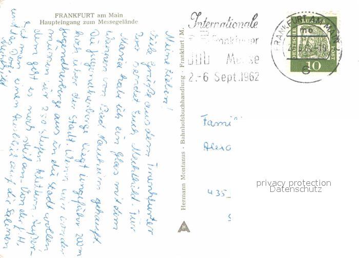 72815688 alte Postkarte Frankfurt Main Haupteingang zum Messegelaende Nachtaufnahme postalisch gelaufen Erhaltung siehe scans [FriedD77] KatCode: 11110006412000