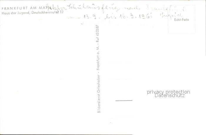 72096631 alte Postkarte Frankfurt Main Haus der Jugend postalisch gelaufen Erhaltung siehe scans KatCode: 11110006412000