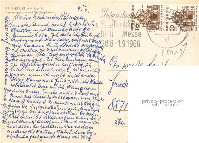 73845624 alte Postkarte Frankfurt Main Henninger Turm und Stadtansicht postalisch gelaufen Erhaltung siehe scans [FriedD77] KatCode: 11110006412000