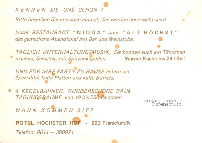 73837808 Frankfurt Main Hotel Hoechster Hof Gastraeume Rezeption Bar Kegelbahn postalisch nicht gelaufen Werbekarte (keine Postkarte) Erhaltung siehe scans [WerneD78] KatCode: 11110006412000