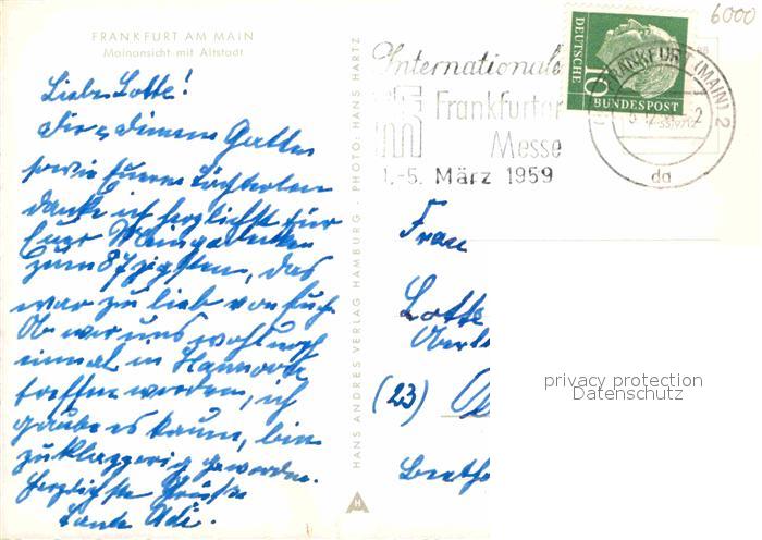 72915309 alte Postkarte Frankfurt Main Mainpartie mit Altstadt postalisch gelaufen Erhaltung siehe scans [WerneD78] KatCode: 11110006412000