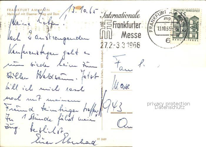 72448552 alte Postkarte Frankfurt Main Mainpartie mt Eisernem Steg und Dom postalisch gelaufen Erhaltung siehe scans KatCode: 11110006412000