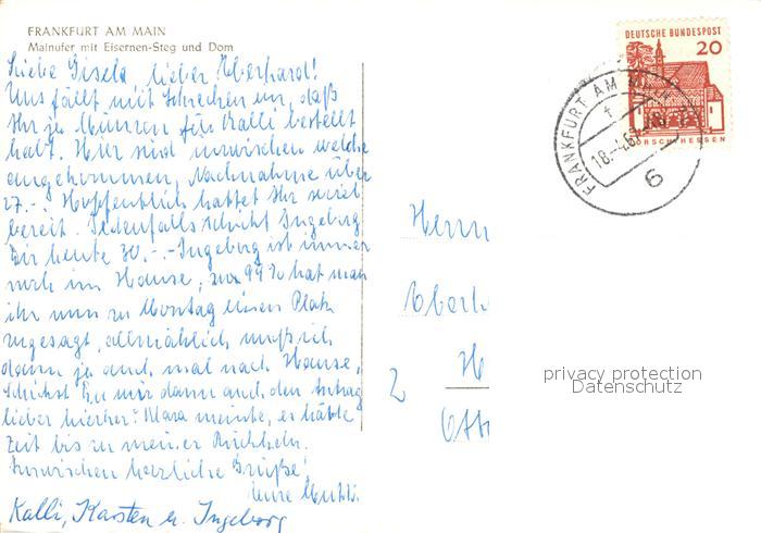 73299001 alte Postkarte Frankfurt Main Mainufer Eiserner Steg Dom postalisch gelaufen Erhaltung siehe scans [PaolaD17] KatCode: 11110006412000