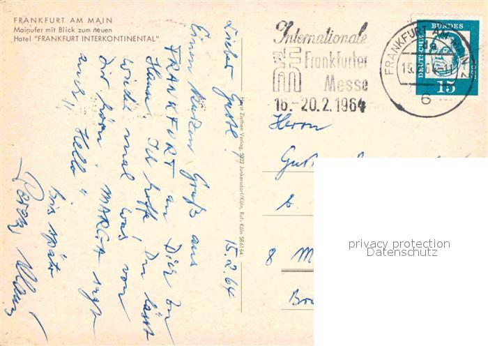 72653631 alte Postkarte Frankfurt Main Mainufer mit Blick zum neuen Hotel Frankfurt Interkontinental postalisch gelaufen Erhaltung siehe scans [FriedD77] KatCode: 11110006412000