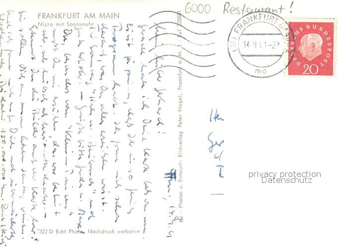73698443 alte Postkarte Frankfurt Main Malerisches Nizza mit Sonnenuhr Uferpromenade Kirche postalisch gelaufen Erhaltung siehe scans [FriedD77] KatCode: 11110006412000