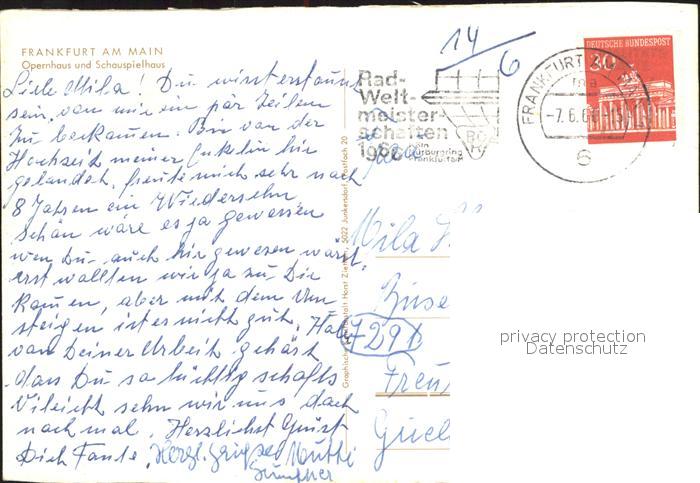 72136112 alte Postkarte Frankfurt Main Opernhaus Schauspielhaus postalisch gelaufen Erhaltung siehe scans KatCode: 11110006412000