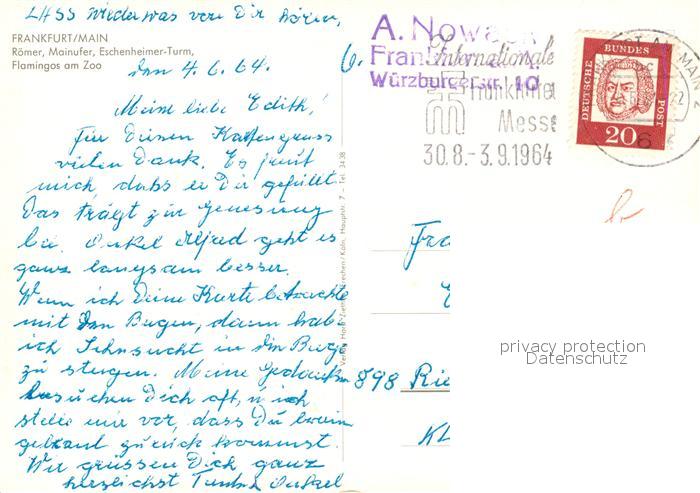 73163376 alte Postkarte Frankfurt Main Roemer Mainufer Eschenheimer-Turm Flamingos am Zoo postalisch gelaufen Erhaltung siehe scans [LiesaD40] KatCode: 11110006412000