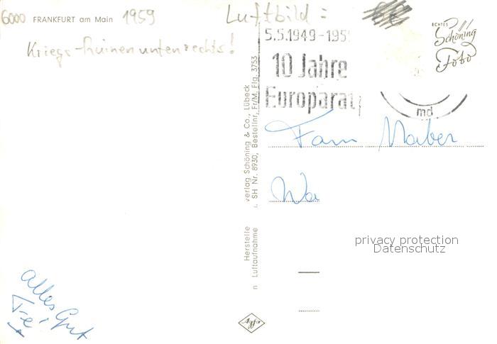 73698446 alte Postkarte Frankfurt Main Stadtpanorama Blick ueber den Rhein postalisch gelaufen Fliegeraufnahme Erhaltung siehe scans [FriedD77] KatCode: 11110006412000