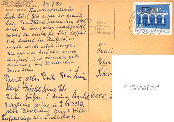 73655170 alte Postkarte Frankfurt Main Zuerich Hochhaus postalisch gelaufen Erhaltung siehe scans [FriedD77] KatCode: 11110006412000