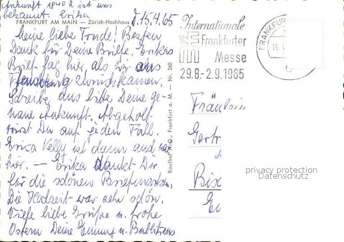 72591736 alte Postkarte Frankfurt Main Zuerich Hochhaus postalisch gelaufen Erhaltung siehe scans [WerneD78] KatCode: 11110006412000