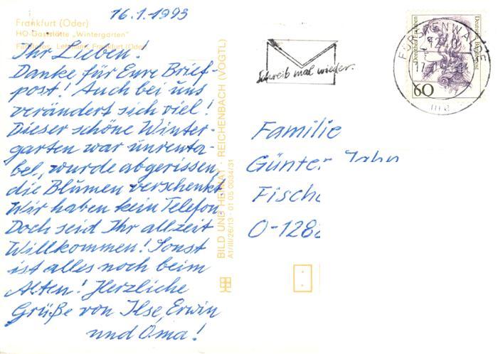 73880588 alte Postkarte Frankfurt Oder HO Gaststaette Wintergarten postalisch gelaufen Erhaltung siehe scans [WerneD78] KatCode: 11110012053000