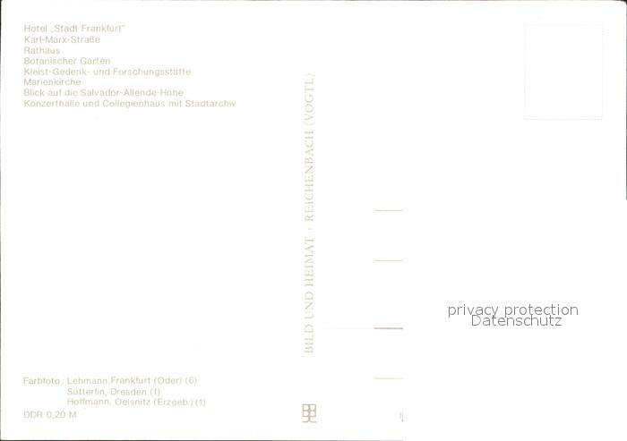 72328906 Frankfurt Oder Hotel Stadt Frankfurt Karl Marx Strasse Rathaus Botanischer Garten Kleist Gedenkstaette Marienkirche Salvador Allende Hoehe Konzerthalle Collegienhaus postalisch nicht gelaufen Erhaltung siehe scans KatCode: 11110012053000