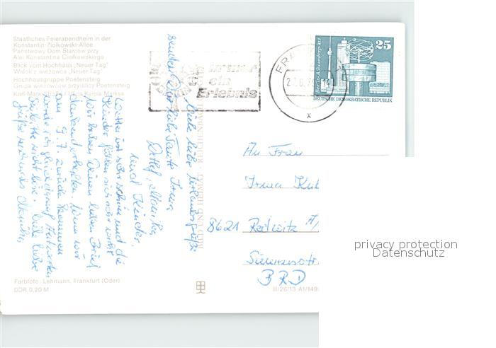 72136281 alte Postkarte Frankfurt Oder Staatl Feierabendheim Hochhausblick Hochhausgruppe Poetensteig Karl Marx Strasse postalisch gelaufen Erhaltung siehe scans KatCode: 11110012053000