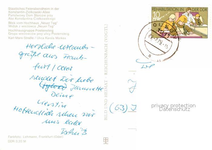 72629206 alte Postkarte Frankfurt Oder Staatl Feierabendheim Hochhausblick Neuer Tag Poetensteig Karl Marx Strasse postalisch gelaufen Erhaltung siehe scans [WerneD78] KatCode: 11110012053000