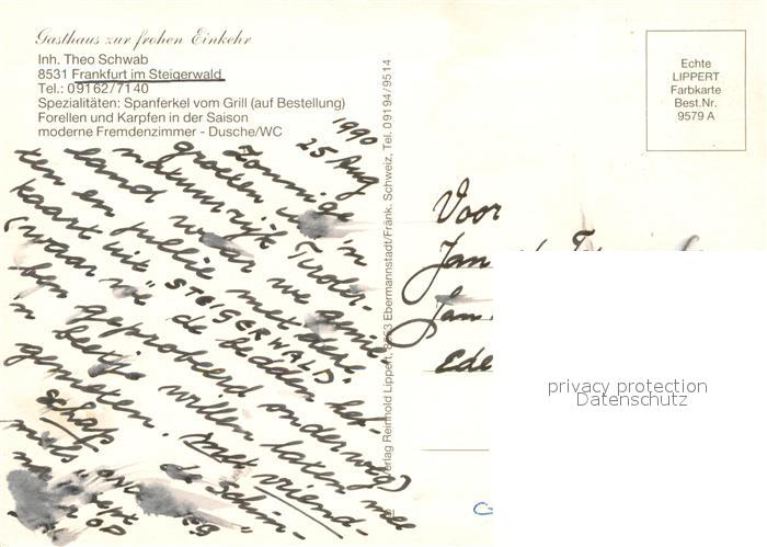 73716156 Frankfurt Steigerwald Gasthaus zur frohen Einkehr Gaststube Gaestezimmer Ortsansicht postalisch nicht gelaufen Erhaltung siehe scans [WerneD78] KatCode: 11110009575147