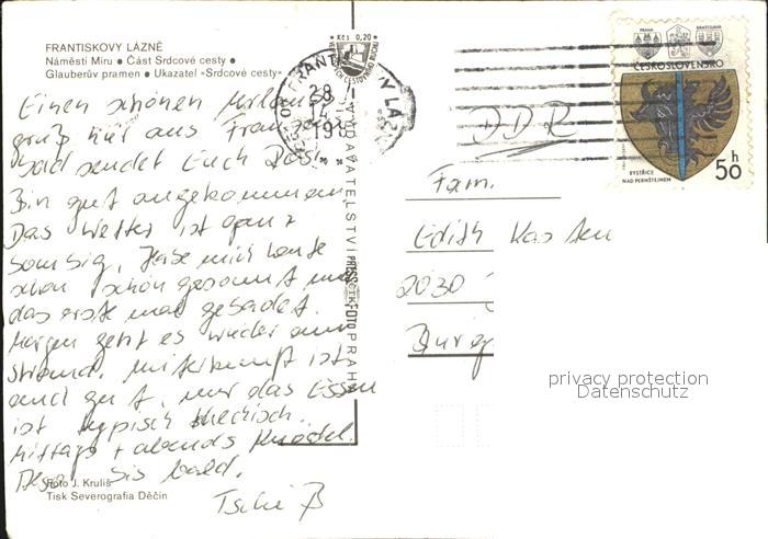 old postcard Frantiskovy Lazne Namesti Miru Cast Srdcove cesty Glauberuv pramen Ukazatel Srdcove cesty postalisch gelaufen Erhaltung siehe scans