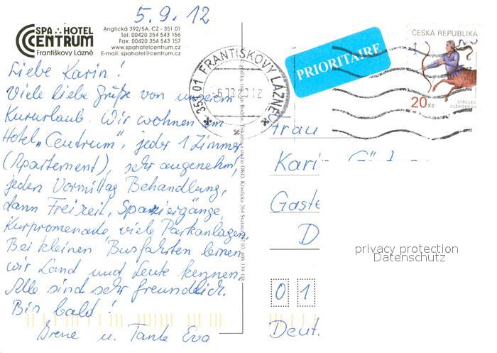 73280548 old postcard Frantiskovy Lazne Spa Hotel Centrum Details postalisch gelaufen Erhaltung siehe scans [WerneD78] KatCode: 11520