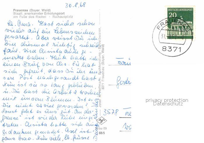 72702309 alte Postkarte Frauenau Rathausplatz Brunnen Kirchturm Erholungsort am Rachel postalisch gelaufen Erhaltung siehe scans [FriedD77] KatCode: 11110009276121