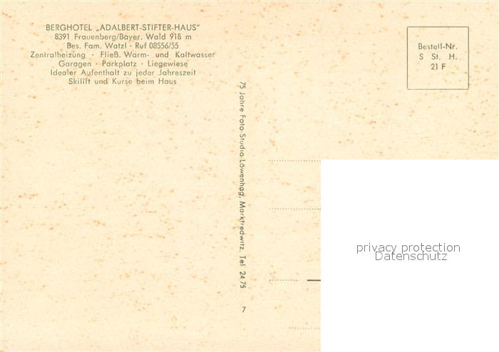 73651789 Frauenberg Bayrischer Wald Berghotel Adalbert Stifter Haus postalisch nicht gelaufen Erhaltung siehe scans [WerneD78] KatCode: 11110009272120